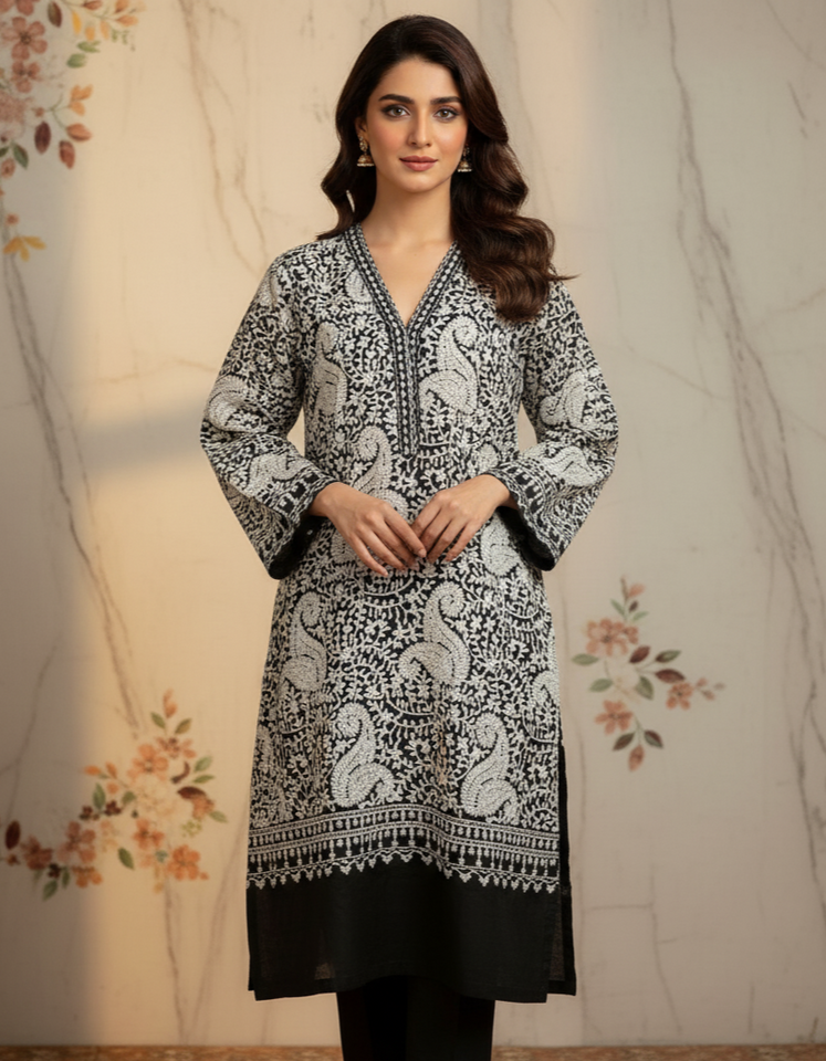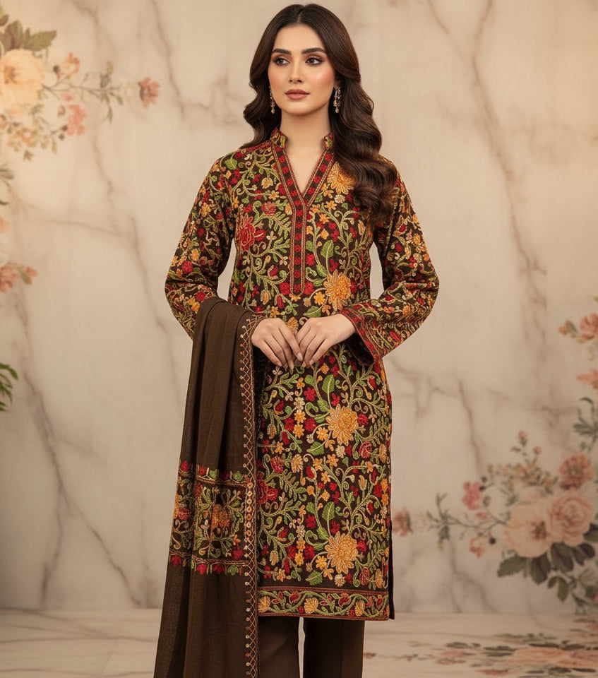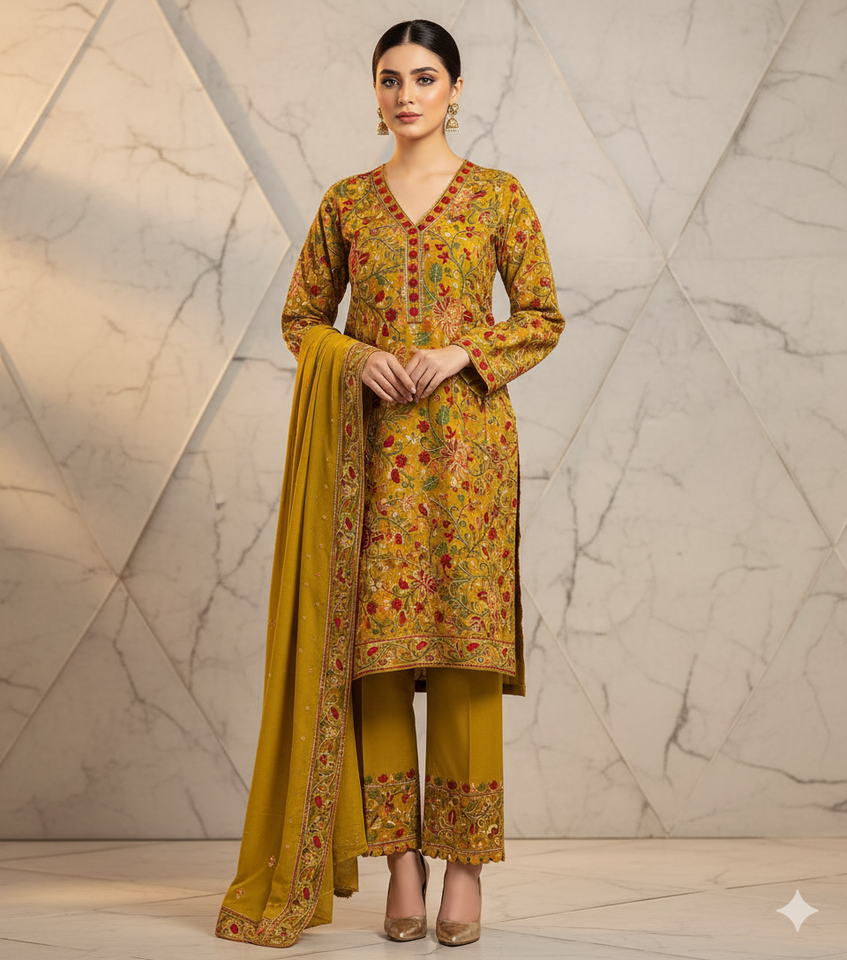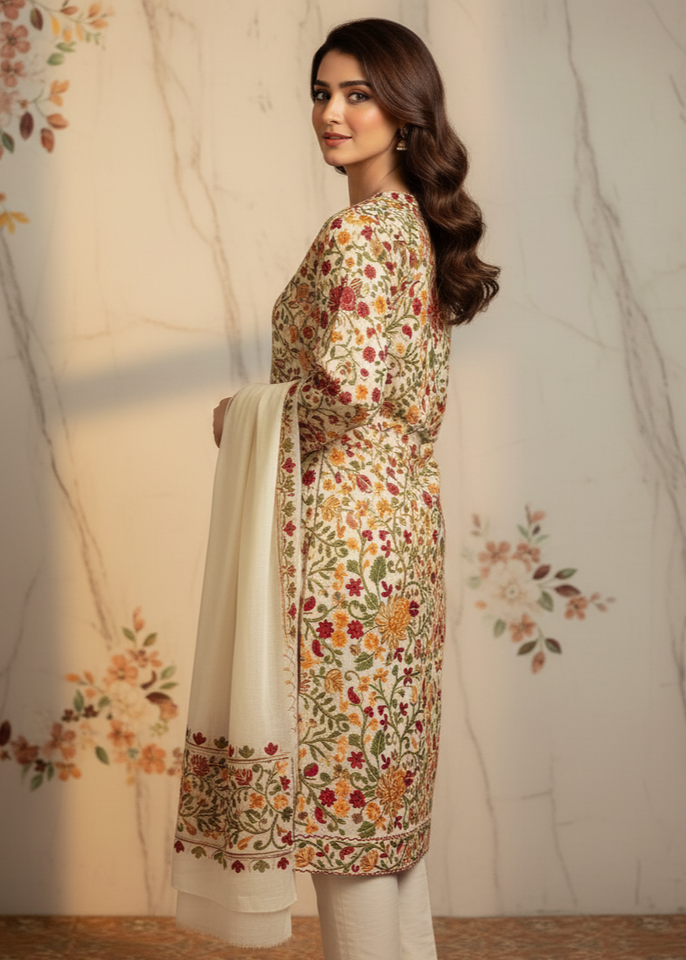 Crafted from premium Pashmina fabric, this outfit offers a soft, warm, and breathable feel — perfect for elegance and comfort. The front and back of the shirt feature intricate Kashmiri embroidered handwork, beautifully woven to reflect timeless craftsmanship. Designed with a modern yet traditional touch, this piece ensures a graceful and comfortable fit for everyone. Ideal for casual wear, office wear, party wear, and travel, it adds sophistication to every occasion. Its cozy texture makes it perfect for winter and cool evenings, while the durable, fade-resistant fabric ensures long-lasting charm and effortless maintenance.